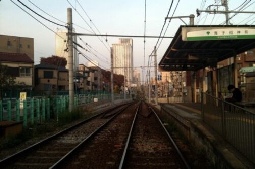 都電荒川線の雑司が谷駅 踏み切り この水車は何だろう?と、みな、不思議がるようだ。私も不思議に思った。